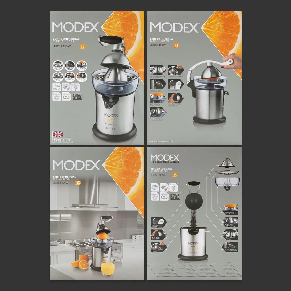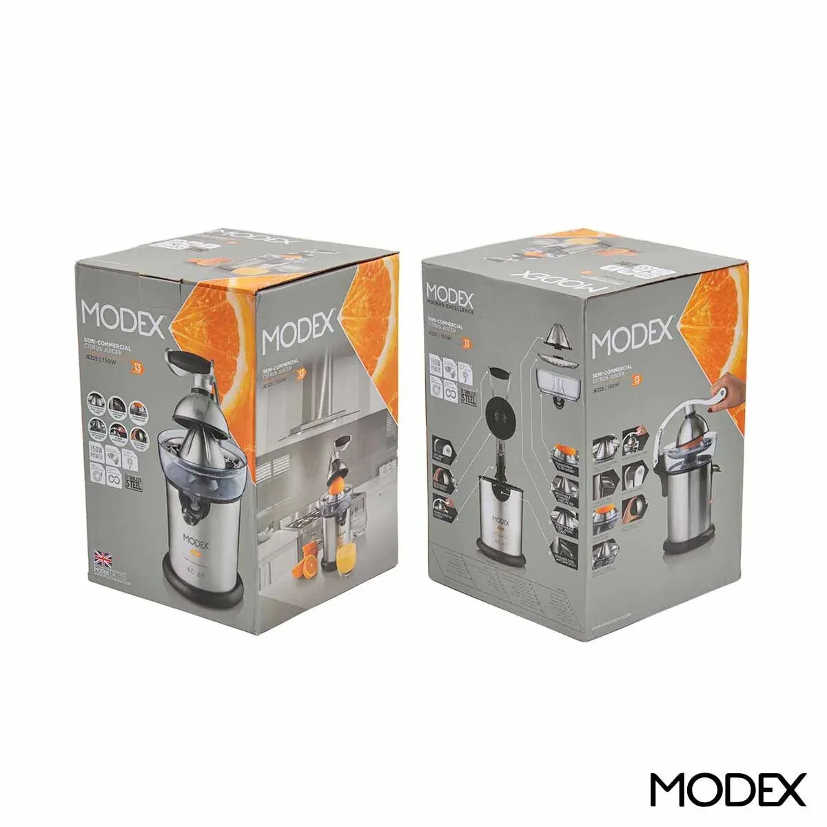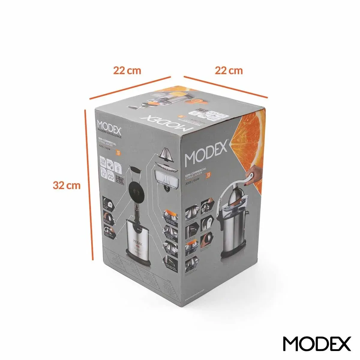 مودکس JE225 با موتور ۱۵۰ وات طراحی شده است. این توان برای آبگیری مرکباتی مثل پرتقال، لیموترش، لیمو شیرین و نارنگی کافی است و در عین حال مصرف برق پایینی هم دارد.