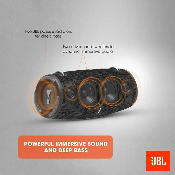 یکی از نقاط ضعف بعضی اسپیکرهای قابل حمل این است که در فضای باز، صدا به راحتی پخش و گم میشود. اما اسپیکر بلوتوثی Xtreme 4 دقیقاً برعکس عمل میکند. رادیاتورهای باس در دو طرف اسپیکر به افزایش گسترهی صدا کمک میکنند و باعث میشوند پشت سر هم پرتاب و تقویت شود.