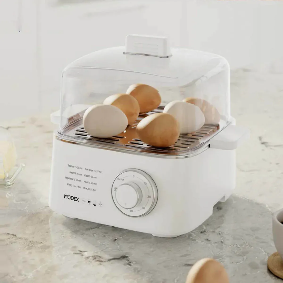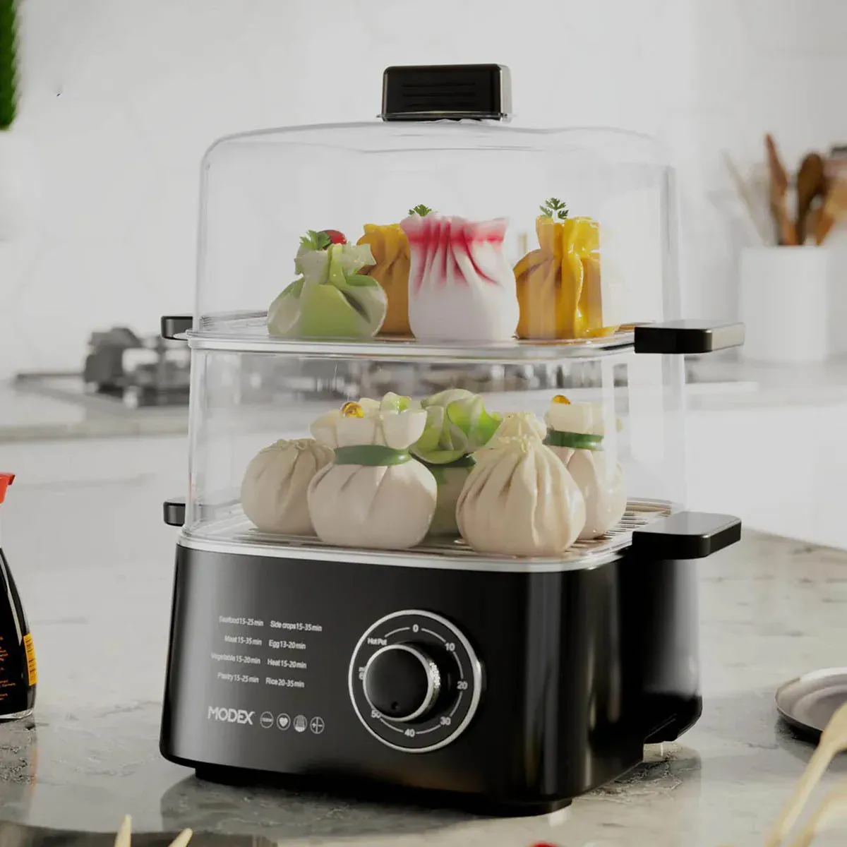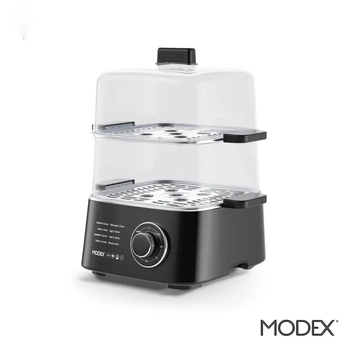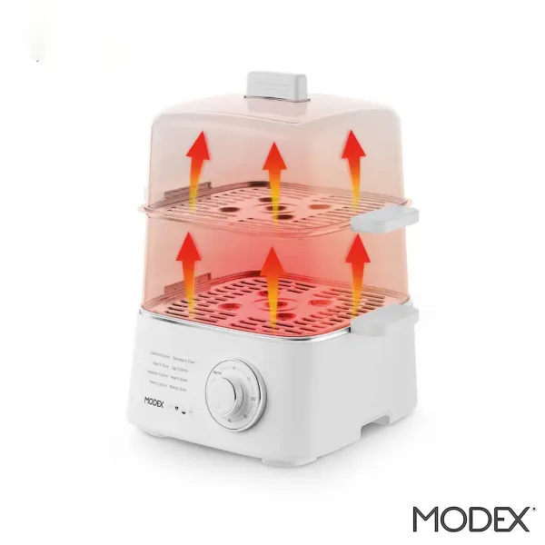 عملکرد بخارپز مودکس FS300 ساده اما کارآمد است. کافی است مخزن مخصوص آب را پر کنید، مواد غذایی را در سینیهای پلاستیکی یا قابلمه استیل قرار دهید و تایمر را روی زمان دلخواه تنظیم کنید. پس از چند ثانیه المنت دستگاه شروع به گرم شدن میکند و بخار به سرعت تولید میشود. این بخار بهطور یکنواخت از سوراخهای سینیها عبور کرده و مواد غذایی را از بالا تا پایین میپزد.