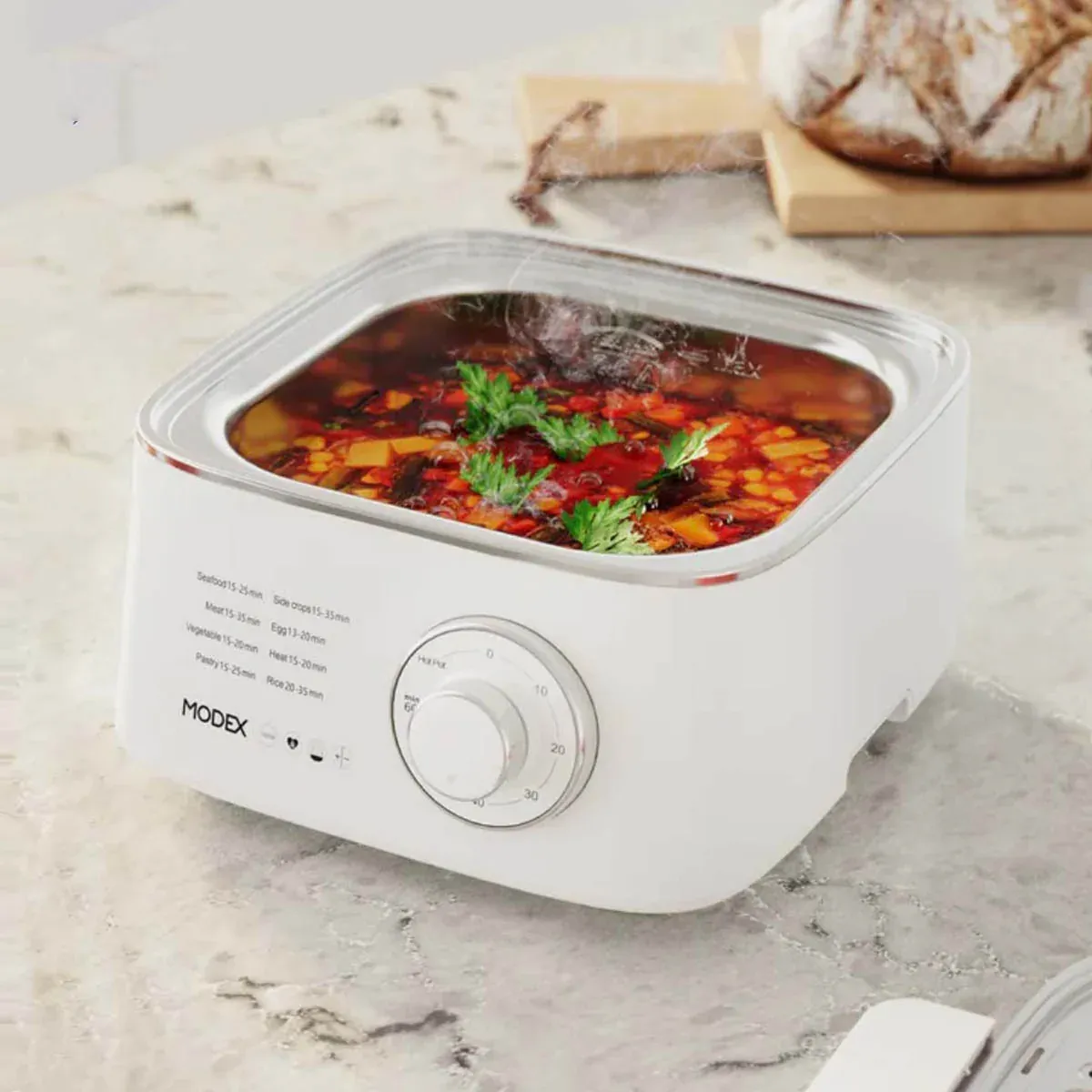این دستگاه با توان 1000 وات بخار را با سرعت بالا تولید میکند و مواد غذایی را ظرف چند دقیقه میپزد. میتوانید زمان کارکرد این بخارپز را با تایمر ۶۰ دقیقهای تنظیم کنید و بدون نگرانی دستگاه را روشن کنید و به کارهای دیگر برسید.