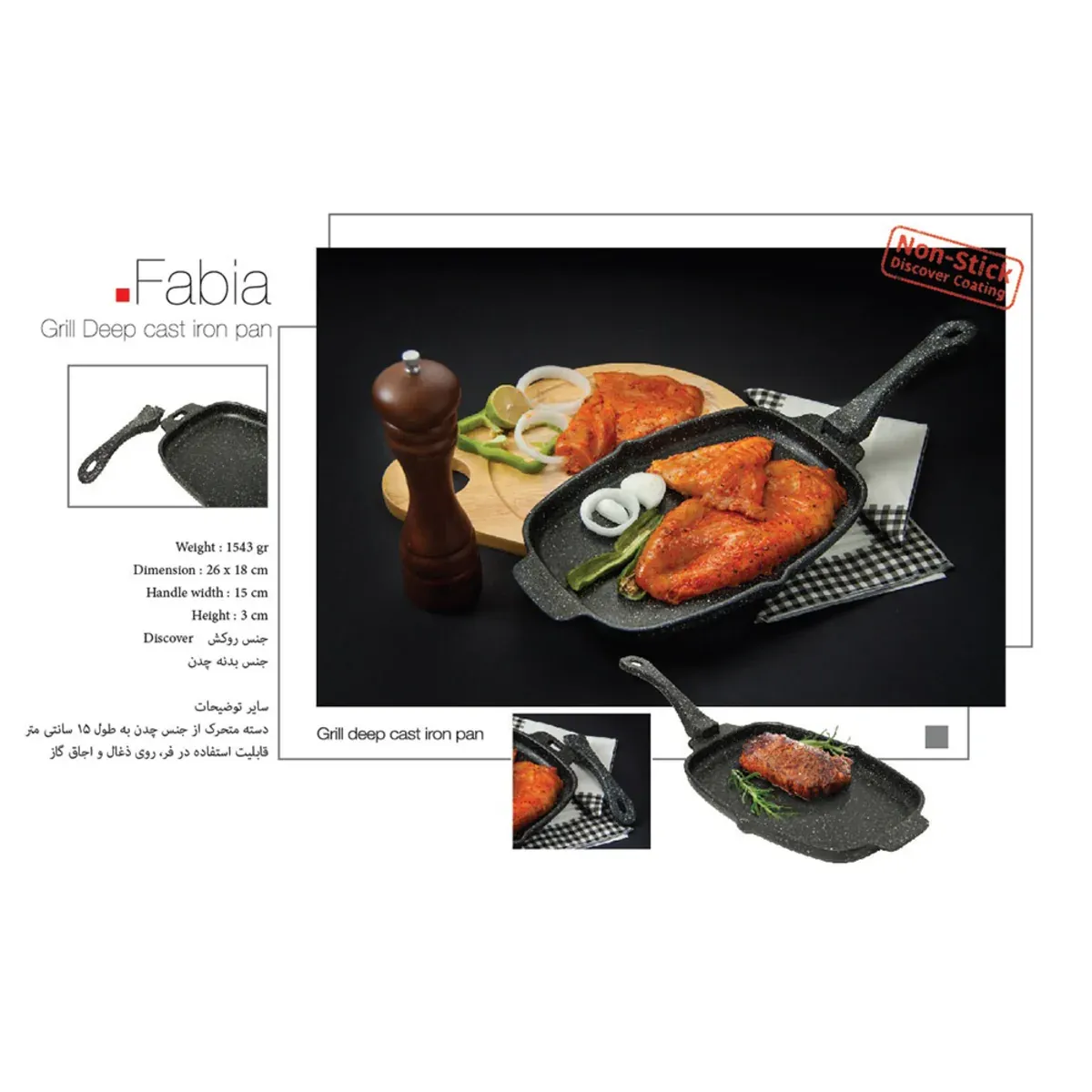 تابه چدن نالینو مدل فابیا fabia با دو دسته ثابت و دسته متحرک، برای طبخ در درجه حرارت بالا طراحی شده است. این تابه از چدن خالص تهیه شده است.