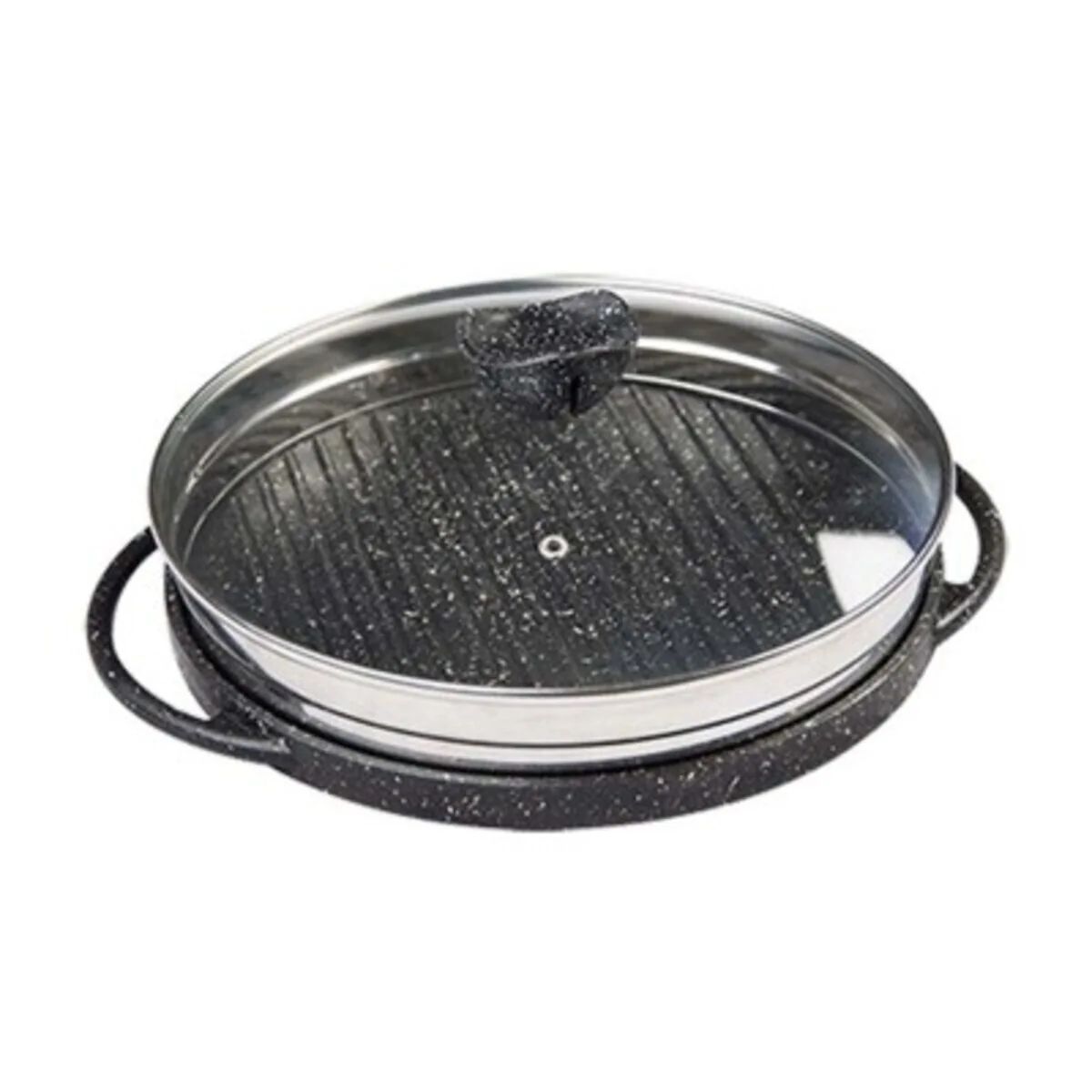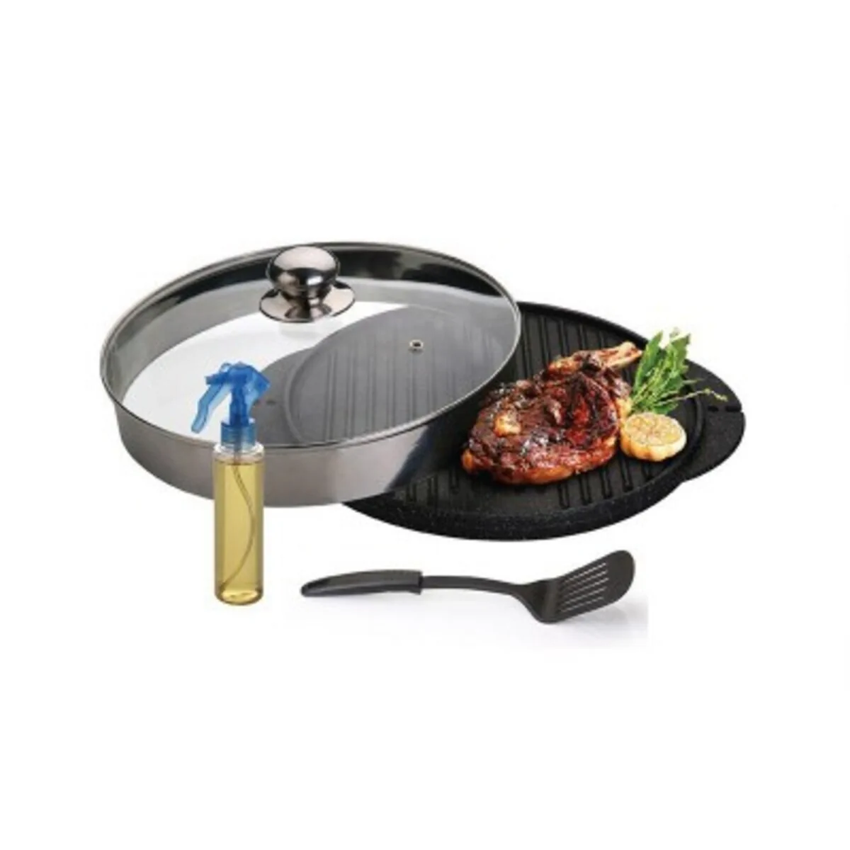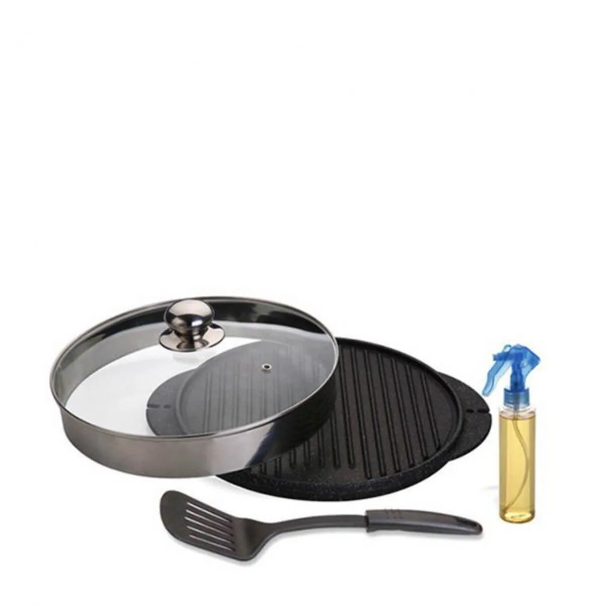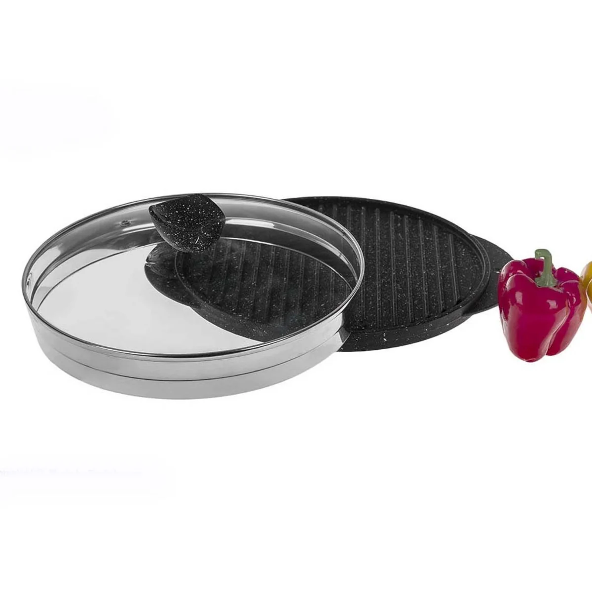تابه گریل یکی از بهترین ظرف هایی است، که باید در هر آشپزخانه ای وجود داشته باشد تا بتوانید انواع گوشت، مرغ، ماهی، استیک، همبرگر و ... را با کمترین میزان روغن ممکن و یا حتی بدون روغن گریل کنید و از خوردن غذایی سالم بهره مند شوید. این تابه چدنی بسیار با کیفیت می باشد. از هر دو طرف قابل استفاده است و یک طرف آن ساده و طرف دیگر آن شیار دار می باشد تا بتوانید روغن و آب مواد غذایی را جدا کنید و یا بر روی آن خط بیندازید. یکی از مزایای این ماهیتابه قابلیت قرارگیری درب است که کامل تابه را می پوشاند و می تواند به مغز پخت شدن انواع مواد غذایی و دورچین شما کمک نماید. از این تابه می توانید روی اجاق گاز، داخل فر و روی ذغال استفاده نمایید و حتی در سفرها همراه خود ببرید.