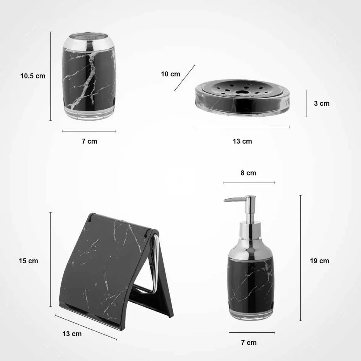 سطل قطر: 19cm ارتفاع: 24cm فرچه قطر: 10cm ارتفاع: 37cm جا مسواکی قطر: 7cm ارتفاع: 10.5cm جا صابونی طول: 13cm عرض: 10cm ارتفاع: 3cm جا دستمالی طول: 13cm ارتفاع: 15cm جا مایعی طول: 8cm عرض: 7cm ارتفاع: 19cm