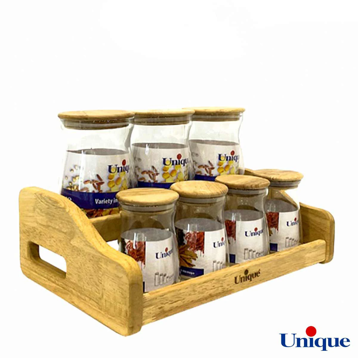 ست پا سماوری یونیک 6130 دارای 7 بانکه شیشه ای با درب چوبی و یک استند نگهداری 2 طبقه از جنس بامبو می باشد. 3 عدد از بانک ها سایز بزرگ و مناسب نگهداری قند شکر و چای هستند و 4 عدد بانکه کوچک مخصوص نمک، زردچوبه و ادویه های دیگر می باشد. بدنه شفاف این جا ادویه ای جدید