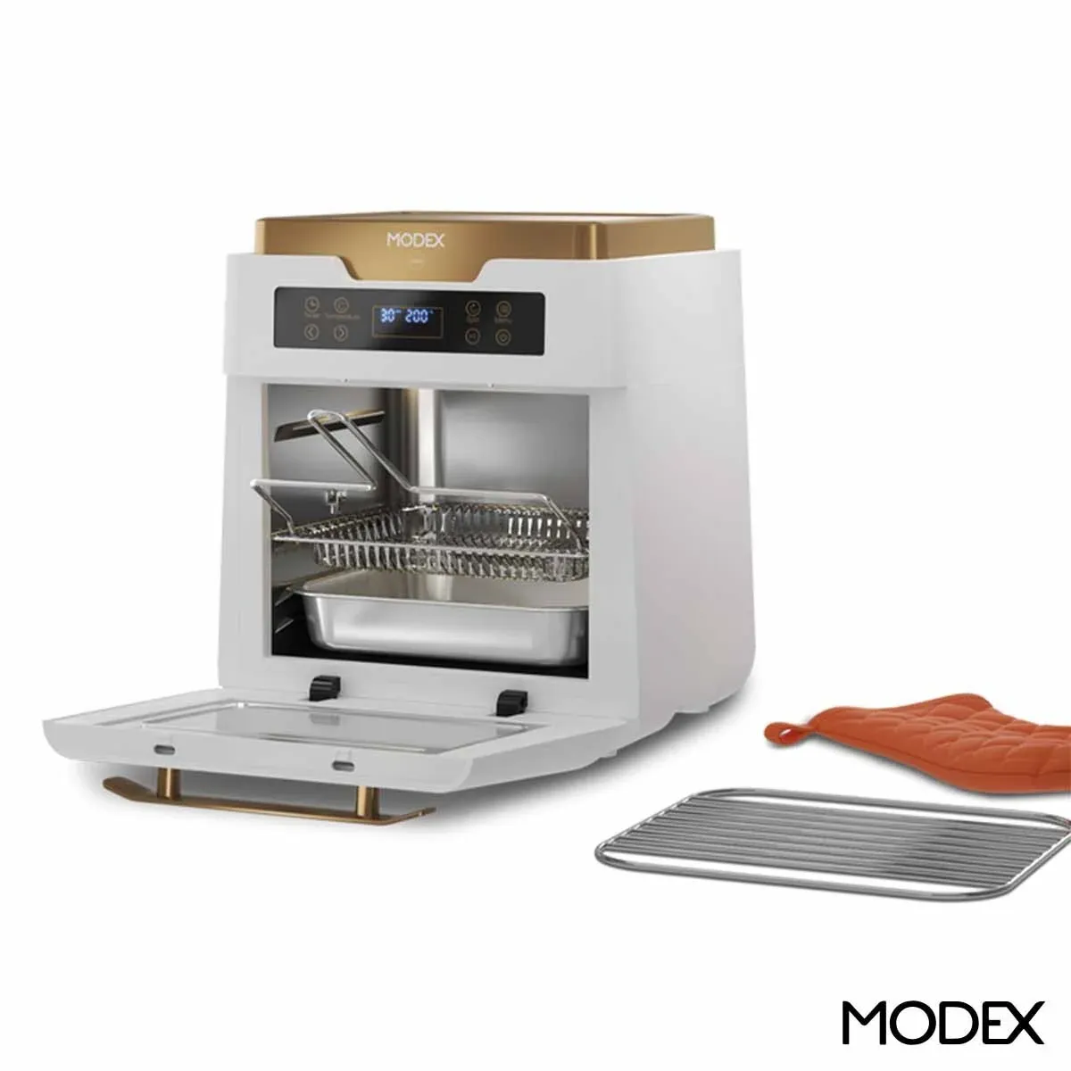 صفحه کنترل لمسی با نمایشگر دیجیتال، تنظیم دما (تا 200 درجه سانتیگراد) و زمان (تا 60 دقیقه) ا. این دستگاه از دیگر مزیتهای خرید هواپز مودکس مدل AF1012 است. لوازم جانبی دستگاه شامل توری روغن، قالب کیک، سینی فر، جوجهگردان و سبد سرخکن اختیار عمل بیشتری را برای پخت غذاهای جورواجور به کاربران میدهد.