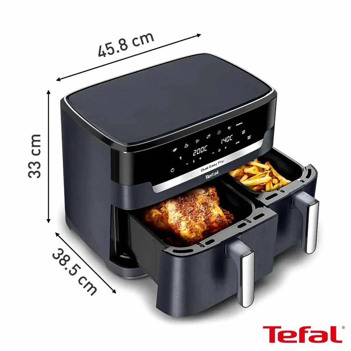 بهطور مثال شما میتوانید در یک کشو این مدل یک مرغ کامل ۲ کیلویی را بریان کنید و در کشوی دیگر آن مقدار زیادی سیبزمینی را سرخ کنید.