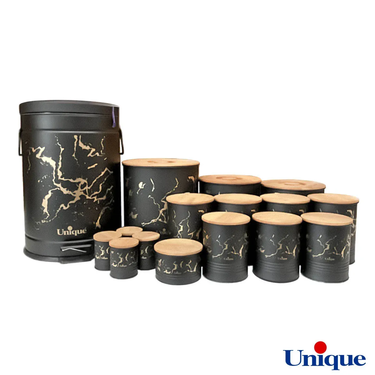 سطل برنج: 1 عدد (درب چوبی واشردار) سطل رباله : 1 عدد (پدالی) طرف قند: 1 عدد (5 کیلویی) ظرف شکر: 1 عدد (5 کیلویی) ظرف حبوبات: 4 عدد ظرف ادویه: 4 عدد