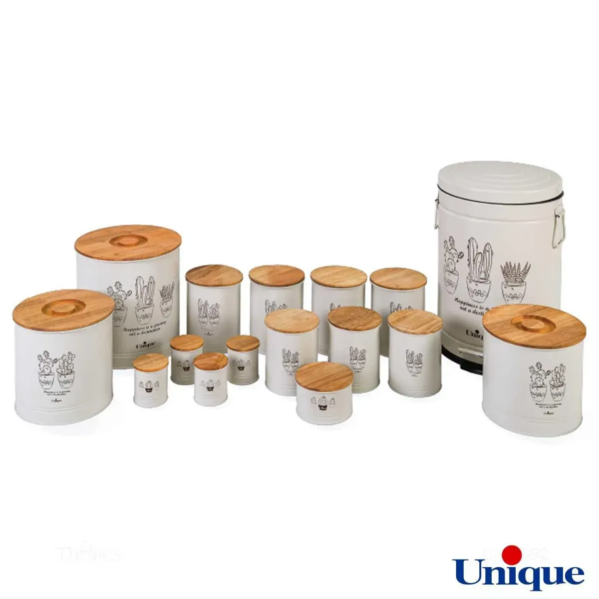 سطل برنج: 1 عدد (درب چوبی واشردار) سطل رباله : 1 عدد (پدالی) طرف قند: 1 عدد (5 کیلویی) ظرف شکر: 1 عدد (5 کیلویی) ظرف حبوبات: 4 عدد ظرف ادویه: 4 عدد
