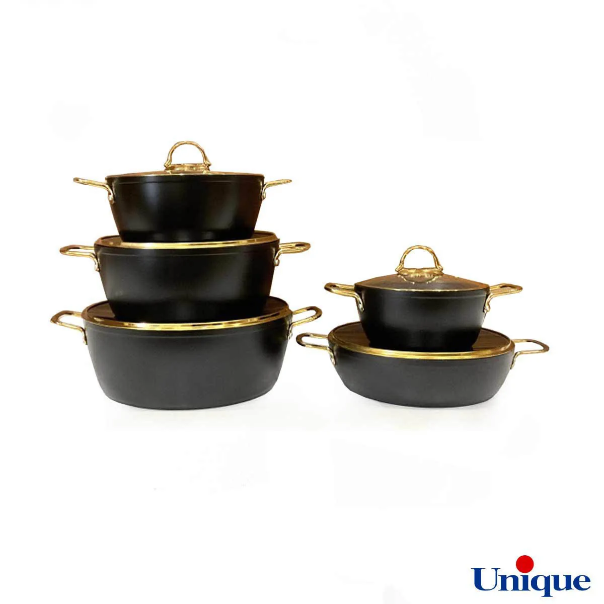 سرویس قابلمه مشکی طلایی برند یونیک که ده پارچه نامیده می شود دارای اقلامی کاربردی می باشد.این اقلام شامل موارد زیر است: