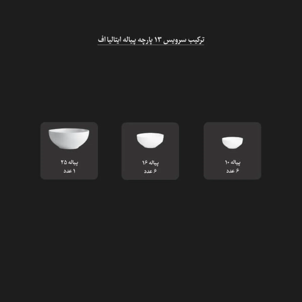 مانند سایر 13 پارچه های چینی زرین، سرویس پیاله ایتالیا اف طرح بیدگل شامل 13 پارچه زیر میباشد: