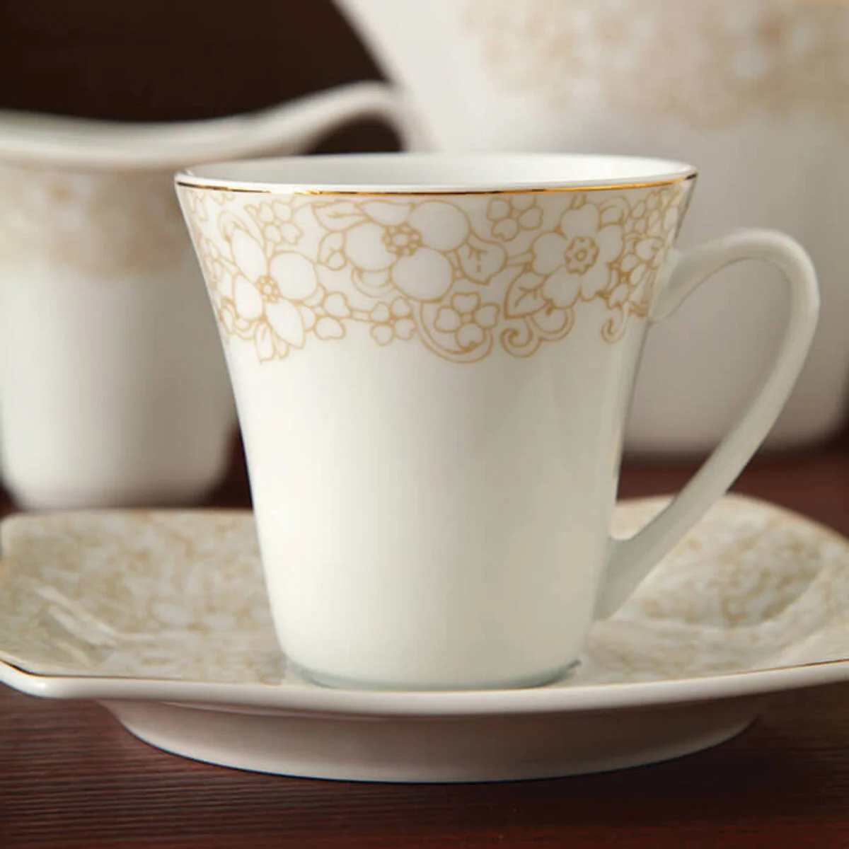 سرویس چای خوری طرح کاترین پیکره آسترو 12 پارچه شامل 6 عدد نعلبکی و 6 عدد فنجان می باشد. انتخاب ظروف چینی با توجه به نوع پذیرایی انجام می پذیرد. به این معنی که برای مراسم رسمی و پذیرایی از میهمانان خاص معمولا از رنگها و نقوش کلاسیک استفاده می شود و برای استفاده روزمره در منزل از سرویس های چینی با رنگهای شاد و اشتها آور به کار گرفته میشود. سرویس چای خوری کاترین بسیار زیبا و ساده است طرحی با گل های طلایی رنگ به صورت نوار پهن دورتا دور ظرف را در برگرفته بنابراین می تواند انتخاب خوبی برای شما در مهمانیها و سرو یک عصرانه یا صبحانه شیک باشد. سرویس چای خوری کاترین مناسب 6 نفره می باشد.