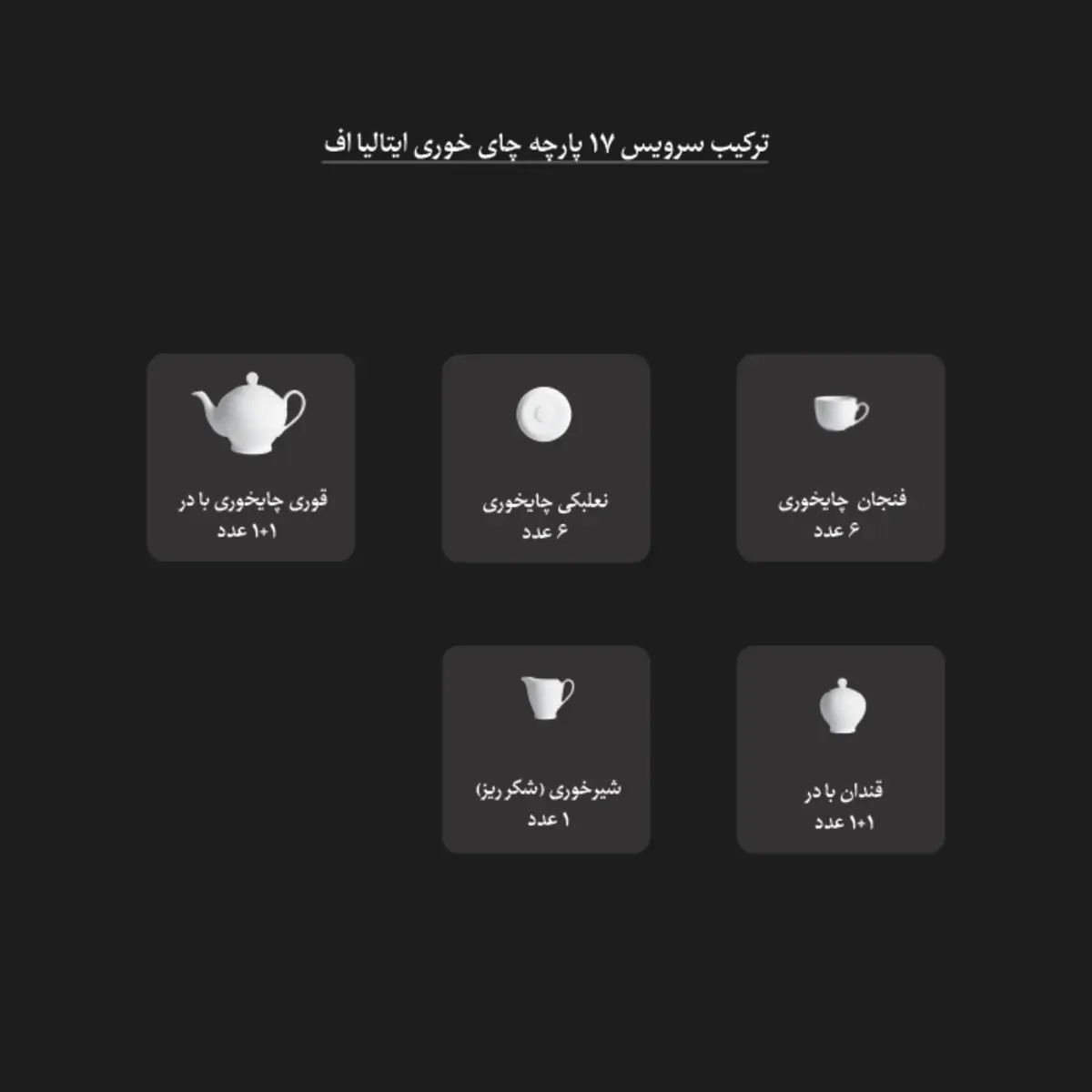 ترکیب سرویس 17 پارچه ایتالیا اف: فنجان: 6 عدد نعلبکی: 6 عدد قوری : 1+1 عدد(قوری+درب) قندان : 1+1 عدد(قندان+درب) شکر ریز : 1 عدد
