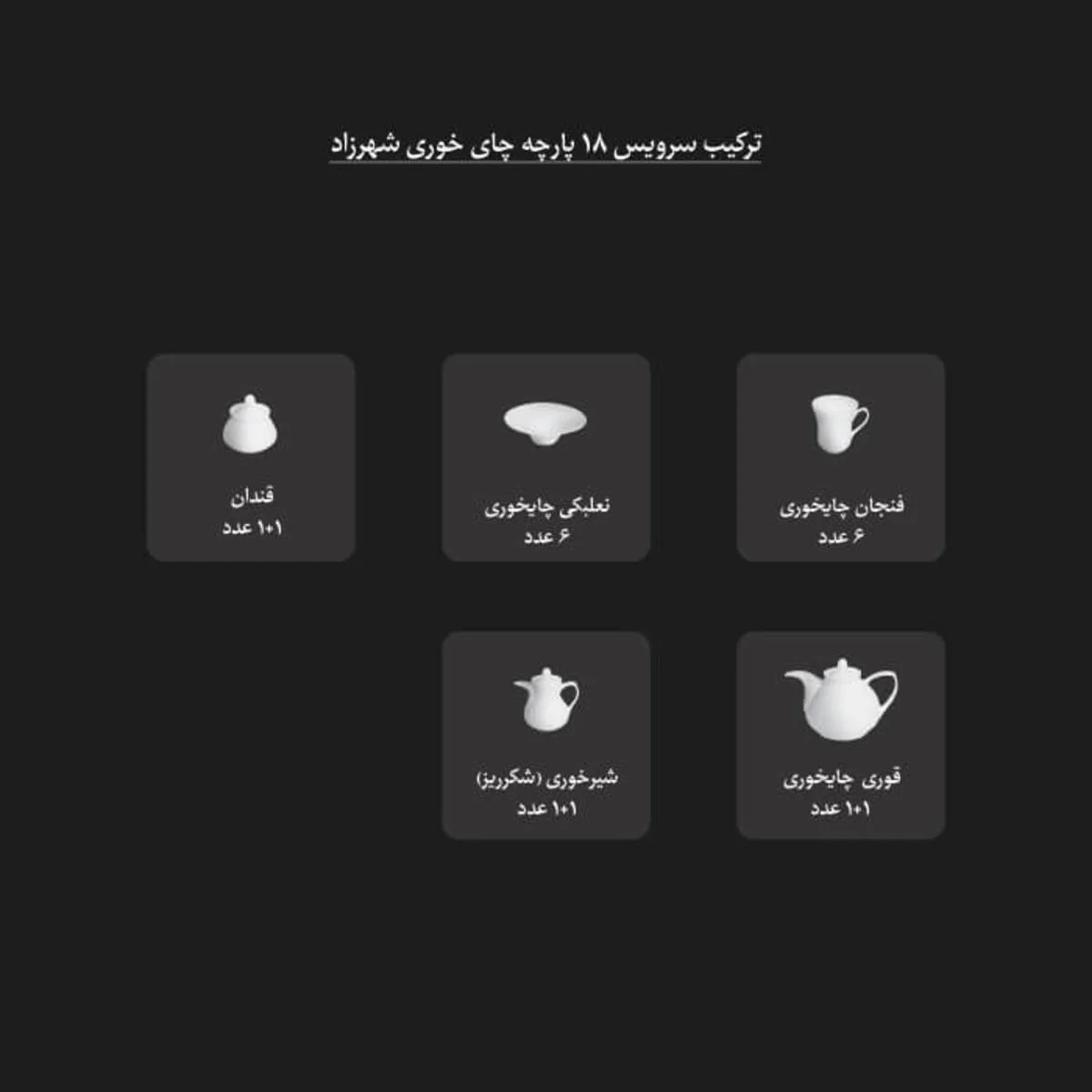 این سرویس پذیرایی ۱۸ پارچه شامل ۶ عدد فنجان چای خوری، ۶ عدد نعلبکی، ۱ عدد قوری، ۱ عدد درب قوری، ۱ عدد قندان، ۱ عدد درب قندان، یک عدد شکرریز و یک عدد درب شکرریز است. به این ترتیب شما می توانید با استفاده از آن به خوبی از مهمان های خود پذیرایی کنید و هیچ نیازی به تهیه اقلام اضافه نداشته باشید.