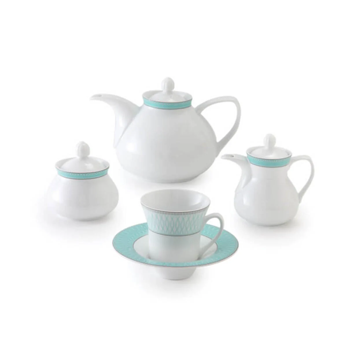 سرویس چای خوری ژانتی فیروزه ای چینی زرین یکی از زیباترین محصولات این برند است که رنگ زمینه سفید دارد. چینی زرین در طراحی این سرویس چای خوری از ظروف کلاسیک الهام گرفته و در عین حال از رنگ مدرن فیروزه ای نیز برای زیباتر شدن ظروف استفاده کرده است.
