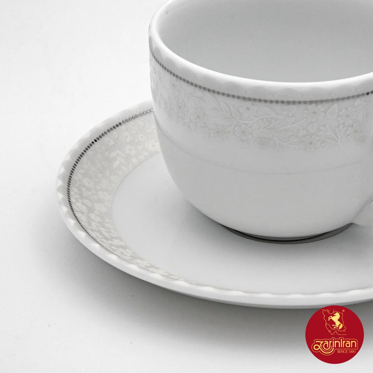 قالب این محصول چینی زرین ایتالیا اف می باشد که دارای ابعاد استاندارد و مناسبی است. طرح این ست چایخوری زیبا، کلارا است که متشکل از یک نوار نقطه چین نقرهای در دور تا دور لبه ظروف می باشد و دارای گلریز های سفید رنگ در زمینه کرم است. ترکیب گلهای سفید روی بدنه کرم و پیکره سفید رنگ این چینی، زیبایی دلربایی به این ست خاص بخشیدهاند.