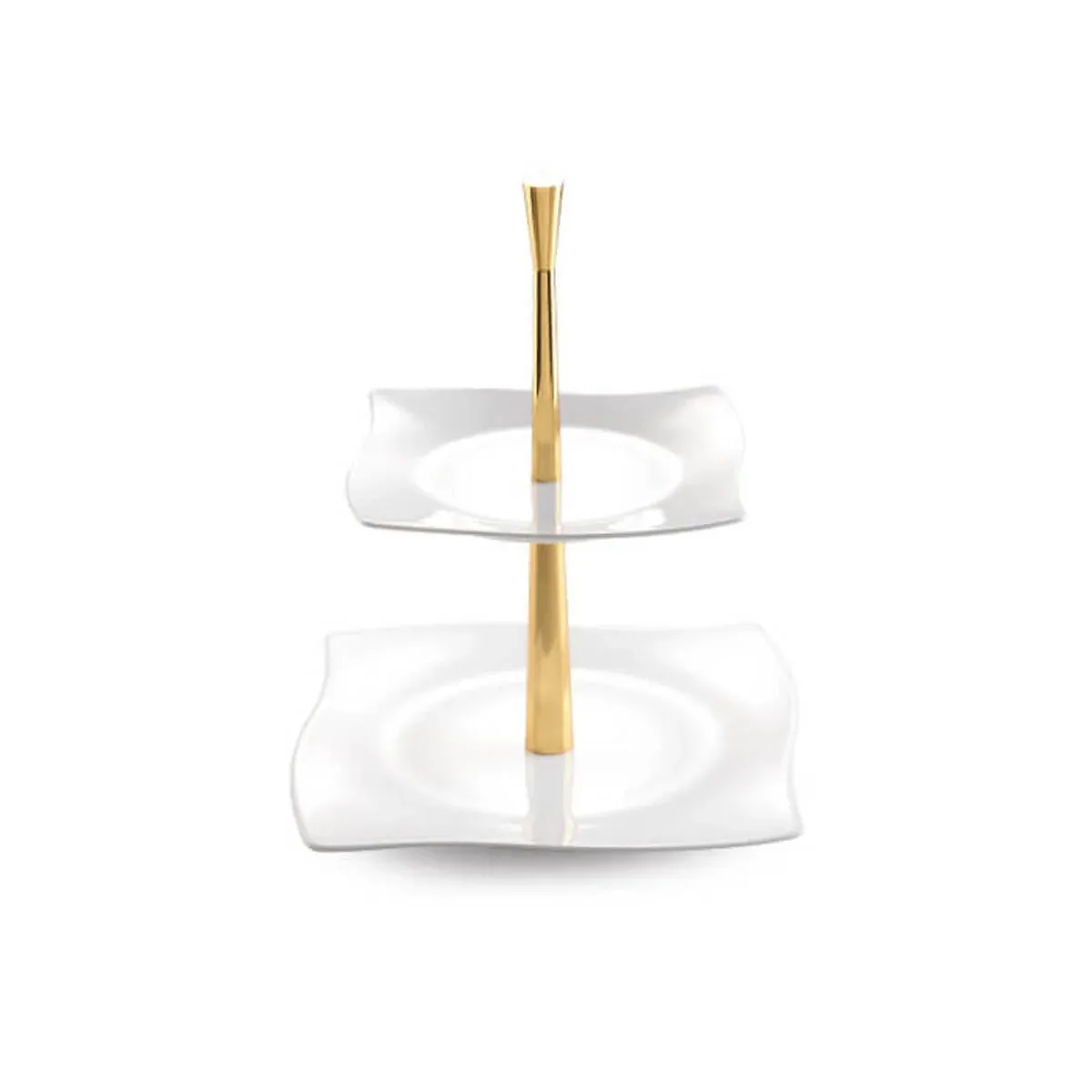 چینی زرین ظرف دو طبقه آسترو سفید با پایه استیل طلایی