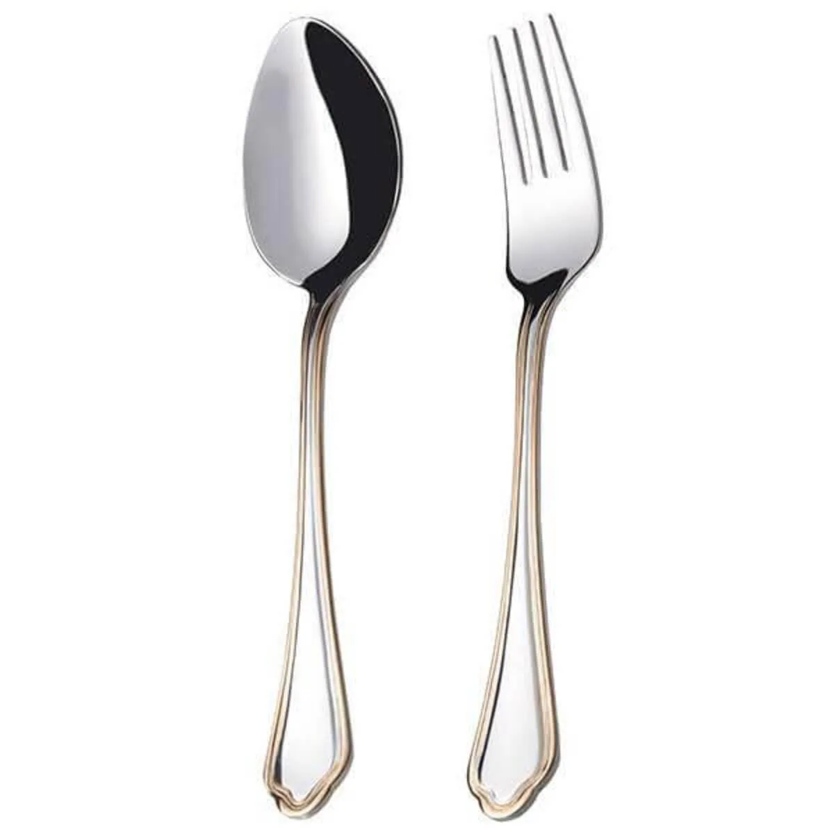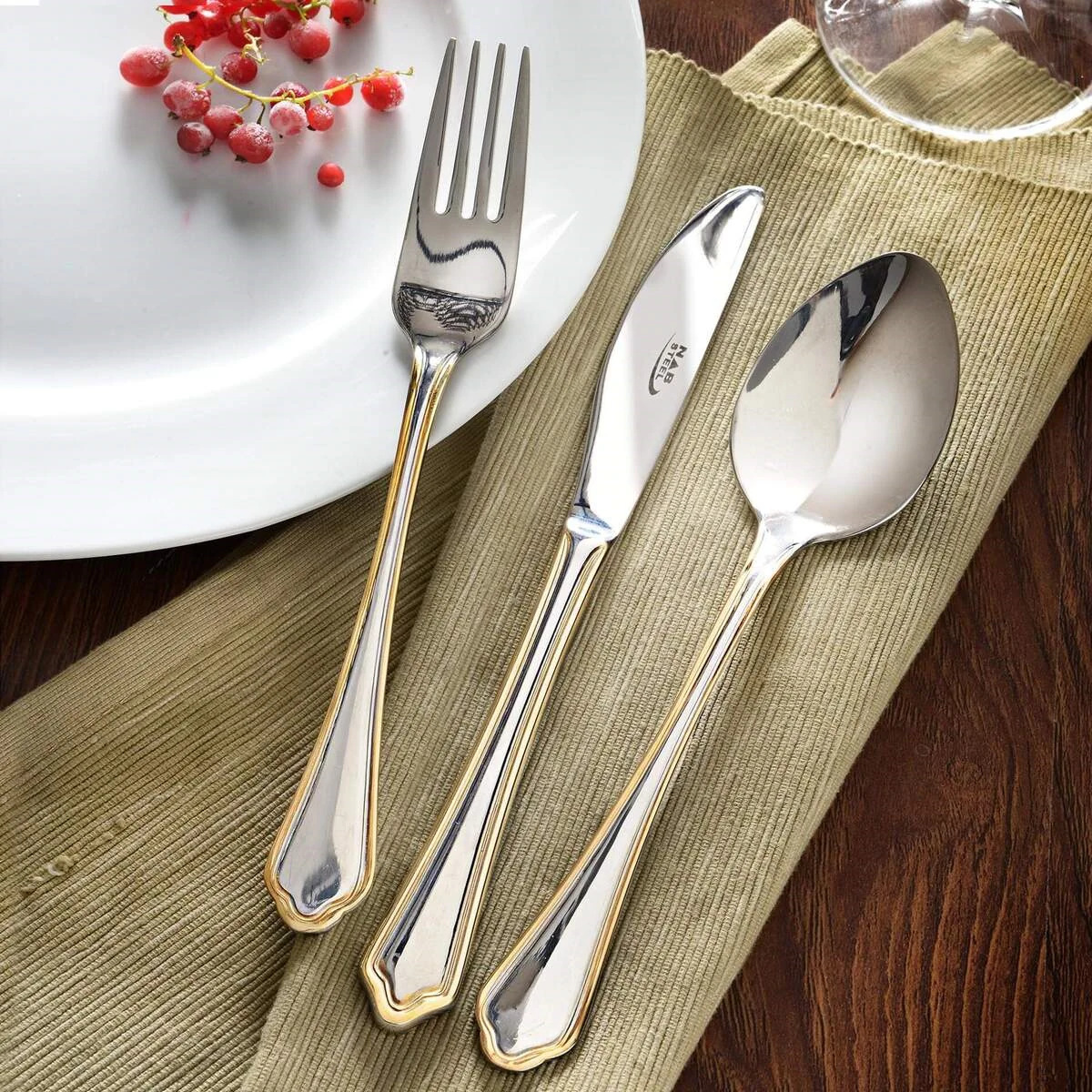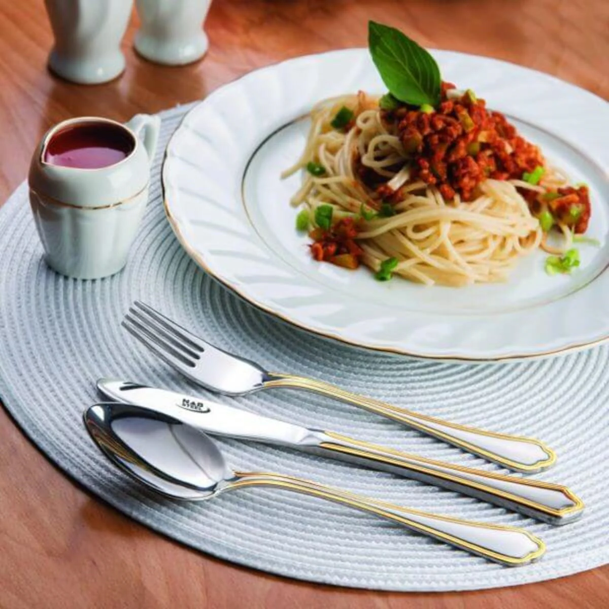 سرویس قاشق و چنگال ناب استیل مدل ونیز دور طلایی 12 پارچه، با طراحی زیبا و کیفیت بالای خود، گزینهای ایدهآل برای تکمیل جهیزیه عروس و یا ارتقای ظروف آشپزخانه شماست.