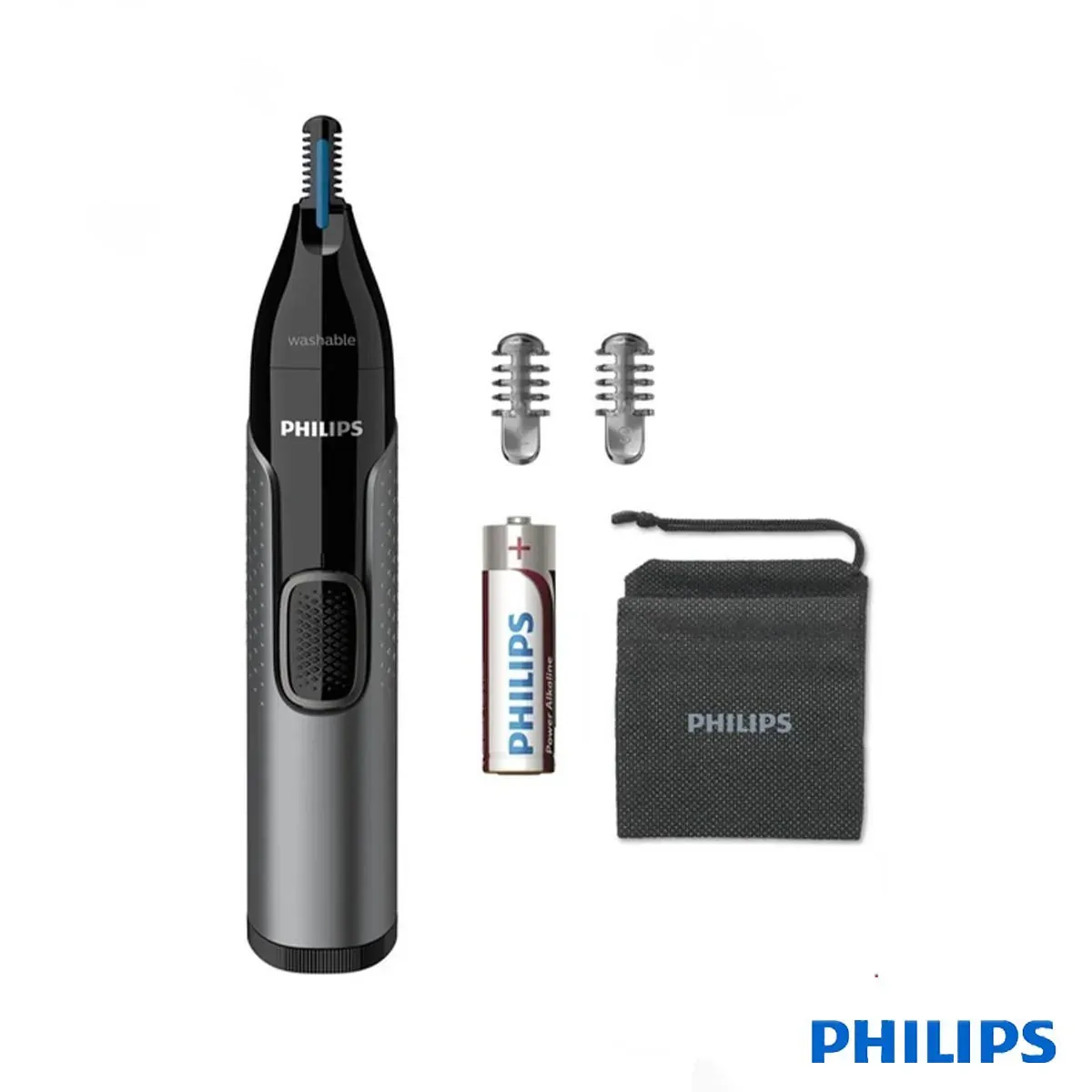 استفاده از فیلیپس NT3650 ساده است. ابتدا باتری را قرار دهید، سری مناسب (3 یا 5 میلیمتری) را انتخاب کنید و دستگاه را روشن کنید. برای بینی، سری را به آرامی داخل سوراخ بینی بچرخانید – گارد محافظ از آسیب جلوگیری میکند.