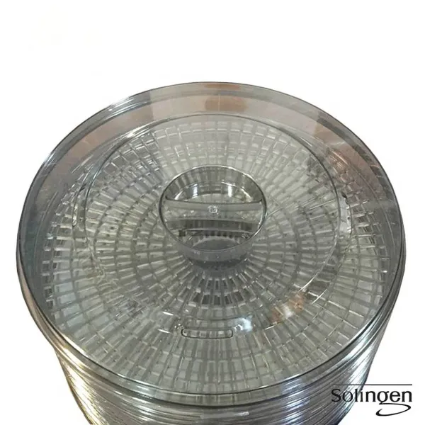 این دستگاه با پنج سینی مجزا و قابل انباشت عرضه میشود. جنس این سینیها از پلاستیک شفاف و مرغوب (ABS) است که نه تنها هیچ واکنش شیمیایی با میوهها نمیدهد، بلکه مقاومت بالایی در برابر حرارت دارد. شفافیت سینیها یک ویژگی بسیار کاربردی است؛ شما بدون نیاز به باز کردن مکرر درپوش و قطع کردن فرآیند خشکسازی (که باعث اتلاف گرما میشود)، میتوانید بهطور چشمی، میزان رطوبت و پیشرفت کار را کنترل کنید.