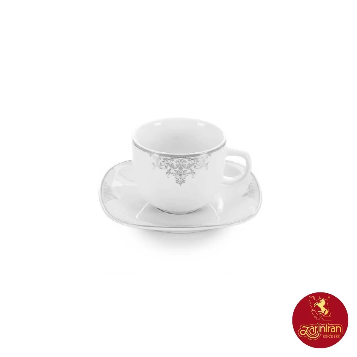 فنجان و نعلبکی های موجود در این سرویس به صورت مربع طراحی شده اند و رنگ قالب در آن ها سفید است. دورتادور آن ها نیز یک خط نسبتا باریک و نقوش نقره ای رنگ به چشم می خورد که باعث شده زیبایی سرویس دو چندان به نظر برسد.