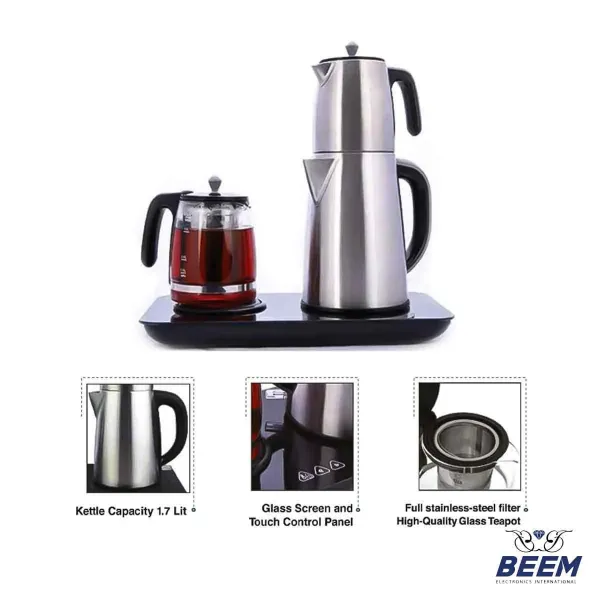 بدنهاش از استیل ضد زنگ ساخته شده که هم خیلی شیک و لوکسه و هم مقاومت بالایی داره. کتریش ۱.۷ لیتر و قوریهاش ۱ و ۱.۲ لیتر ظرفیت دارن. یعنی هم برای یه مهمونی کوچیک مناسبه و هم برای مصرف روزانه کل خانواده.