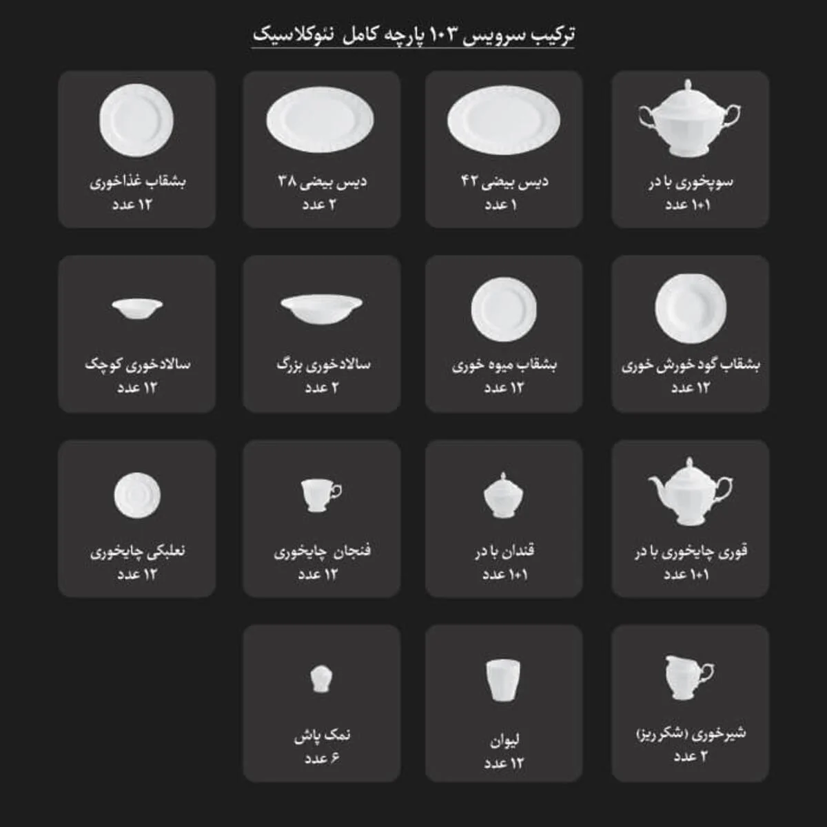 با تهیه این سرویس هر ظرفی که برای سرو غذا نیاز دارید را در اختیار خواهید داشت و به کمک آن میتوانید یک میز پذیرایی کامل و منظم بچینید.