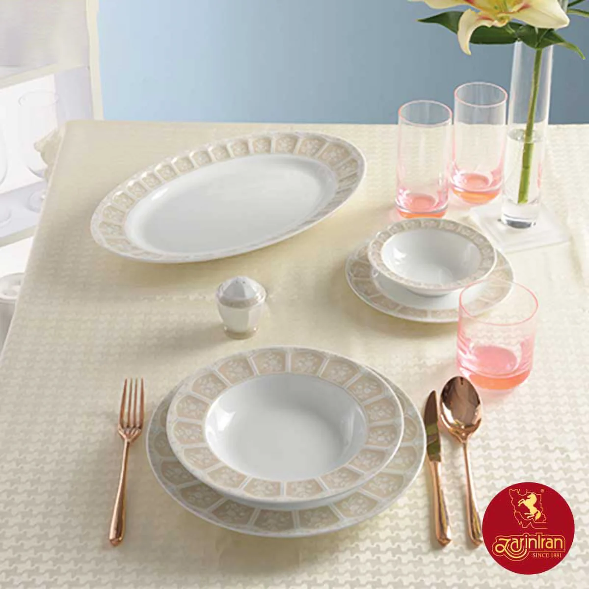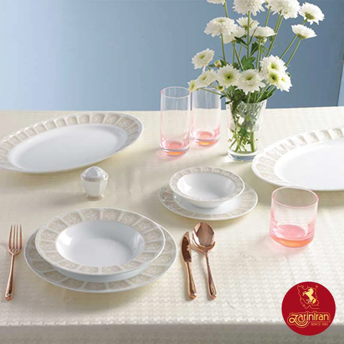 به دلیل استفاده از مرغوبترین نوع چینی، رنگ زمینه ظروف کاملا سفید و درخشان است. رنگ کرمی لبه ظروف به جلوهنمایی هرچه بیشتر غذاها و جذابیت میز پذیرایی شما کمک میکند. روی زمینه کرمی حاشیه ظرفها گلبرگهای ظریف با رنگ روشنتر قرار دارد. برجستگیهای ملایم و جزئی روی لبه نیز، موجب جذابیت بصری بیشتر این ظروف شده است.