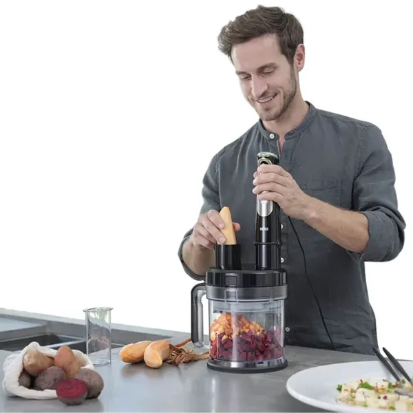 مدل Braun MQ9195 از سری معروف MultiQuick 9 براون است؛ یعنی پیشرفتهترین سری گوشتکوبهای این برند. این دستگاه برای کسانی طراحی شده که میخواهند یک ابزار حرفهای در آشپزخانه داشته باشند که هم بتواند خرد کند، هم هم بزند، هم پوره کند، هم خمیر درست کند و هم مخلوط کند!